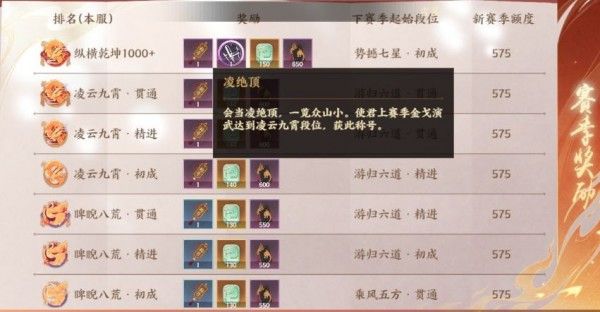 包含段位(从高到低排序):纵横乾坤、凌云九霄、睥睨八方、势撼七星、游归六道、乘风五方、踏歌四海、声闻三界、通晓两仪、一梦忘川。