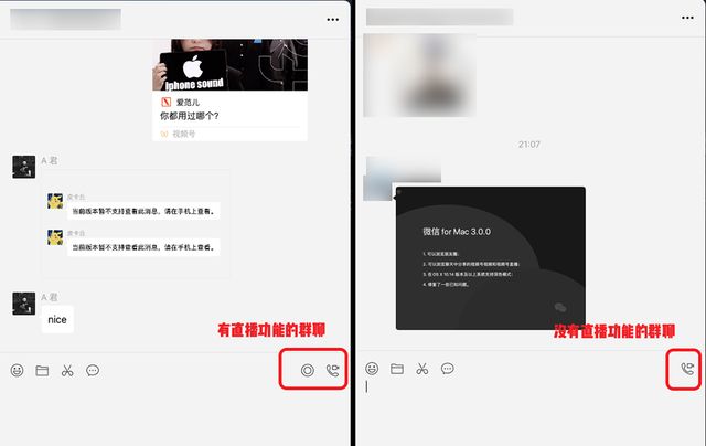 在输入框上方右侧你可以看到一个圆环图标,它就是群直播的入口了。不过此项功能还在灰度中,并不支持所以群聊,即使在最新的微信 for Mac 3.0.0 内测版中,一些群聊也尚未加入此功能。