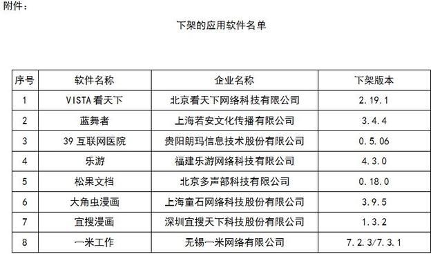 这次被下架的8款APP包括:VISTA 看天下、蓝舞者、39 互联网医院、乐游、松果文档、大角虫漫画、宜搜漫画、一米工作。